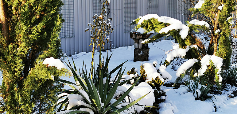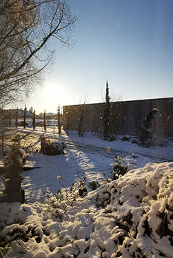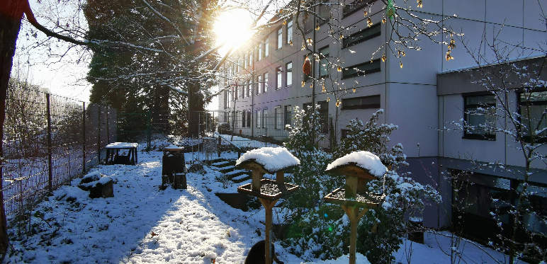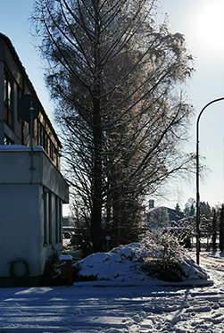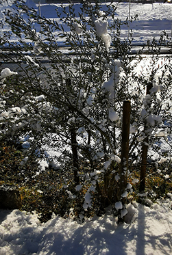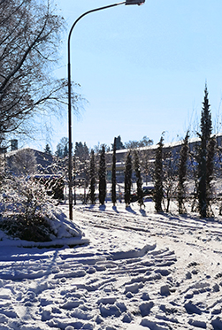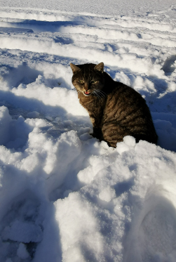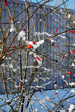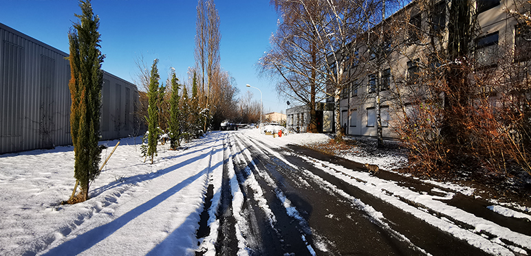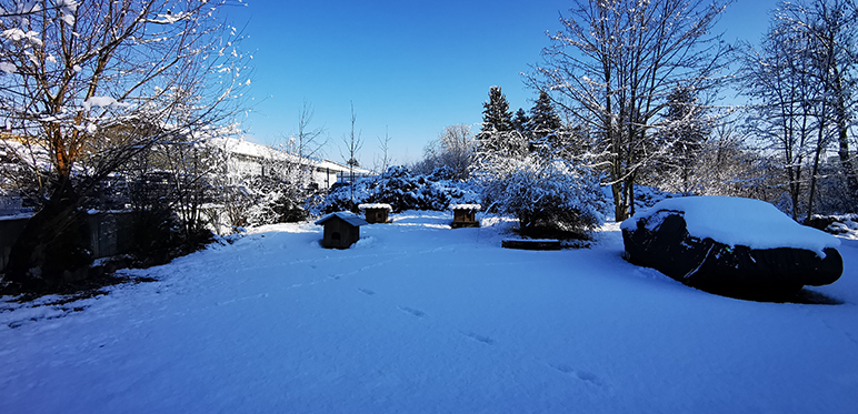 Eine tief stehende Sonne, Fahrspuren durch die Fahrzeuge der Besucher des MK2 in der Einfahrt und auf dem Parkplatz, eine Katze im Schnee, die anderen liegen in ihren Katzenhäuschen. Letzte Hagebutten als Nahrung für die Vögel. Aber auch Vogelhäuschen voll mit Körnern, verschneite Wiesen und allerlei Dinge im Winterschlaf. Ruhe.